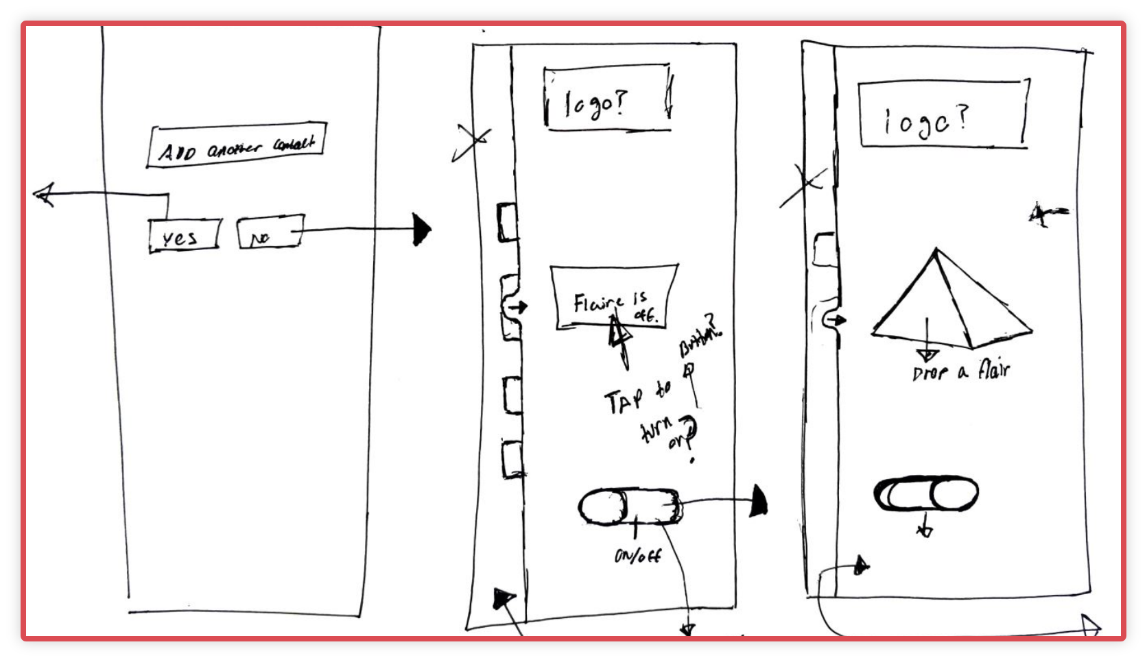 The sketches to the right show an idea for the minimum viable product. The sketches below explore various ideas for different flows in the app.