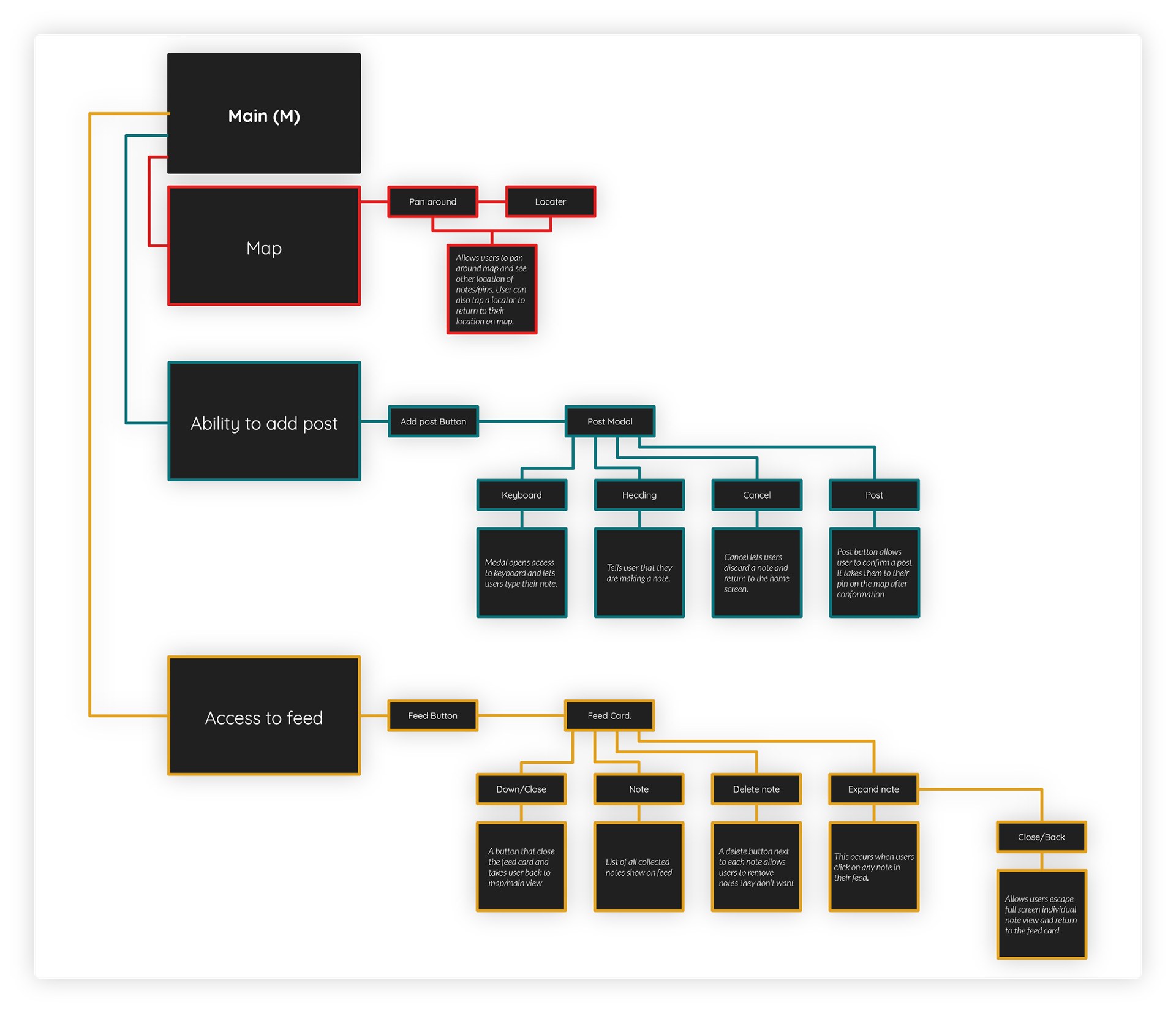 We attempted to solve our target audiences problems by designing an app that allowed them to create location-specific content in real-time. They could do this by posting notes to a community map, these notes could later be collected as content when users crossed paths with them. The map was a core feature within the Stroll app, it allowed users the ability to post content to a specific location and share it with other people nearby. This was important because it allowed users to build feeds that were relevant to them & their location.